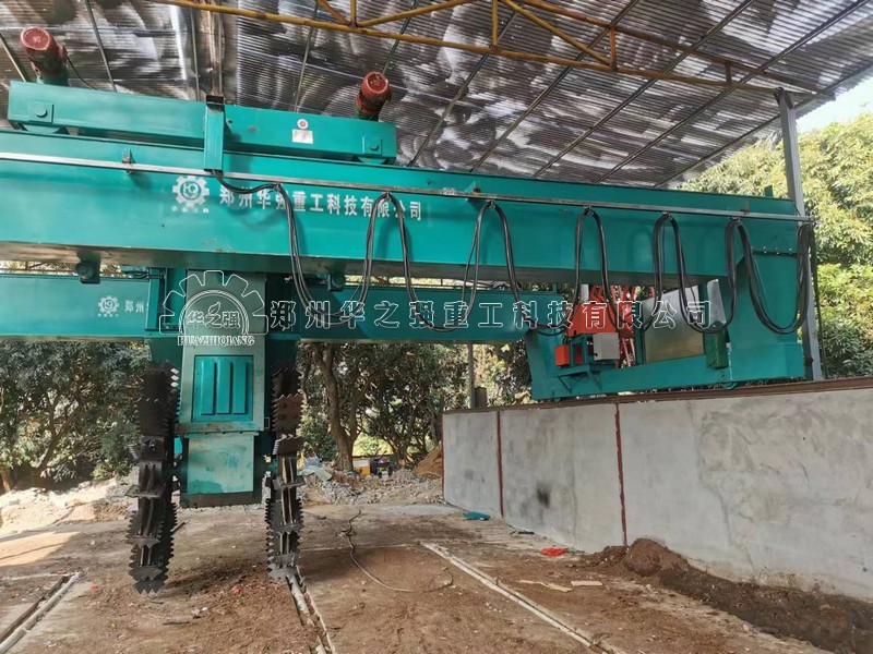 華之強重工輪盤式翻堆機橫跨寬度可更具客戶的具體需要進行定制,翻拋物料深度深、發酵槽長度根據客戶廠房條件來確定。